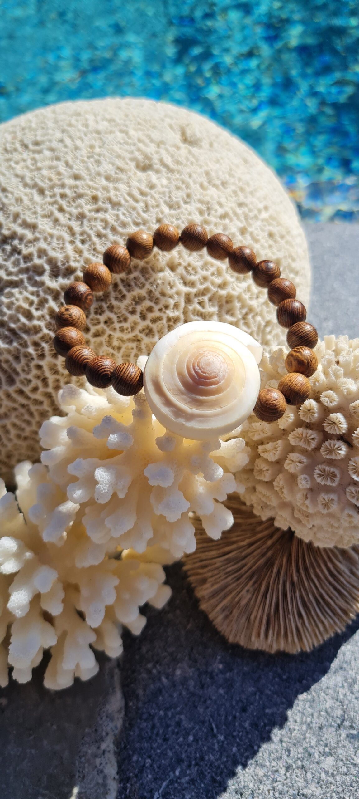 Matériaux : perles de bois naturel, coquillage spiralé brun/ivoire (environ 3.5cm